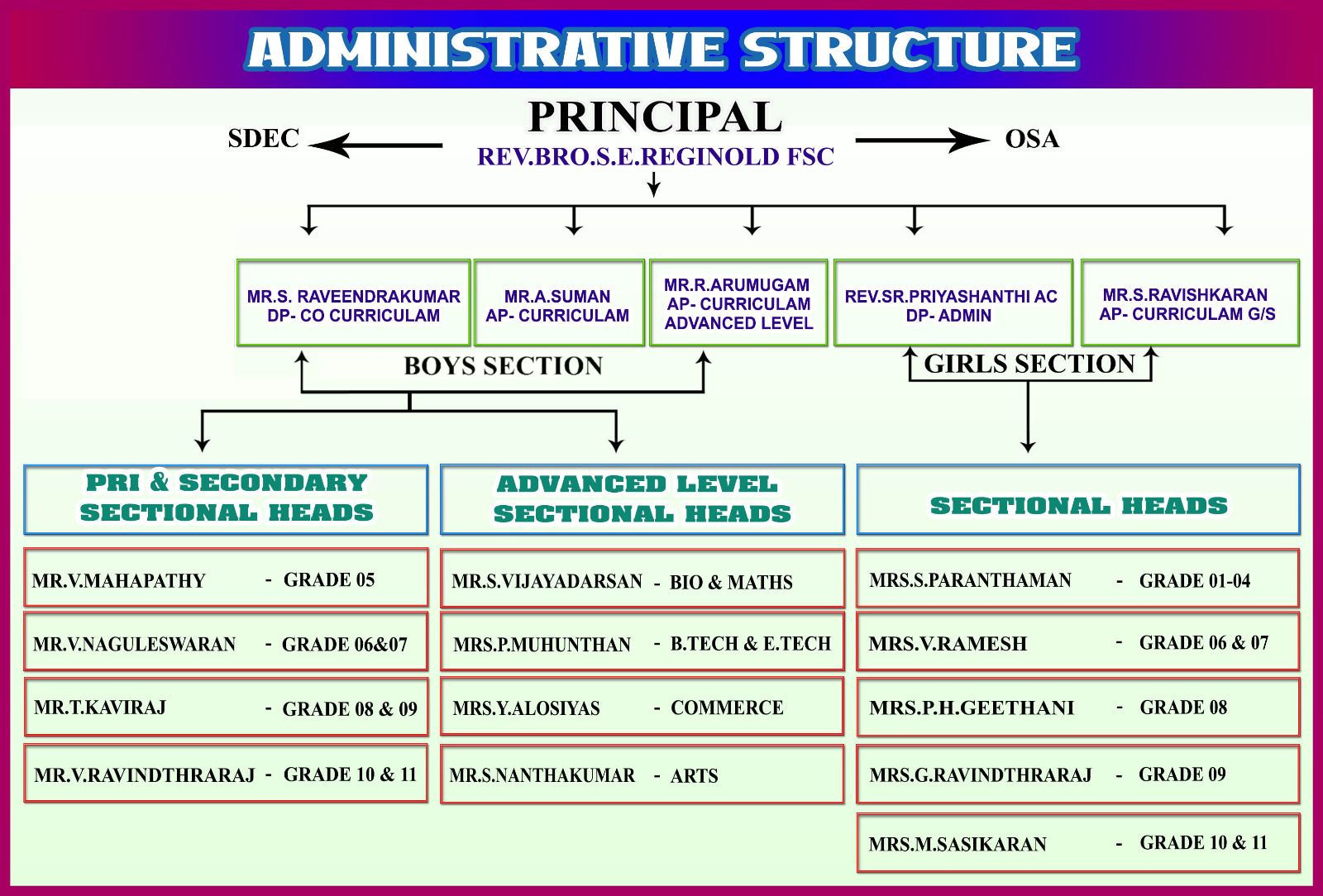 A structured management system ensuring quality education through dedicated leadership teams across all academic levels and sections.